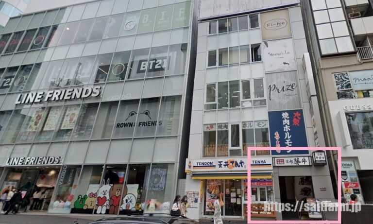 遠目からではわかりにくいのですが、「LINE FRIENDS FLAGSHIP STORE 原宿」を目印にして向かうとわかりやすいかもしれません。隣には「天丼てんや」があります。
